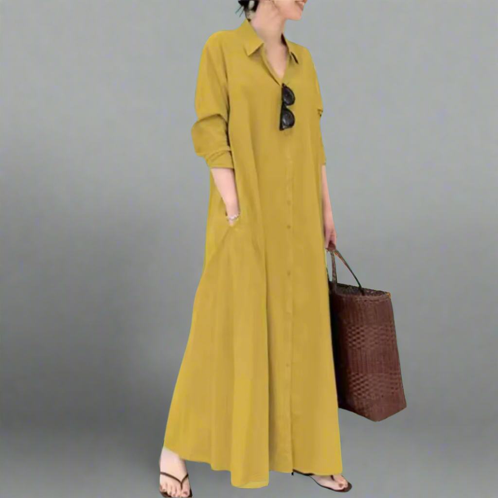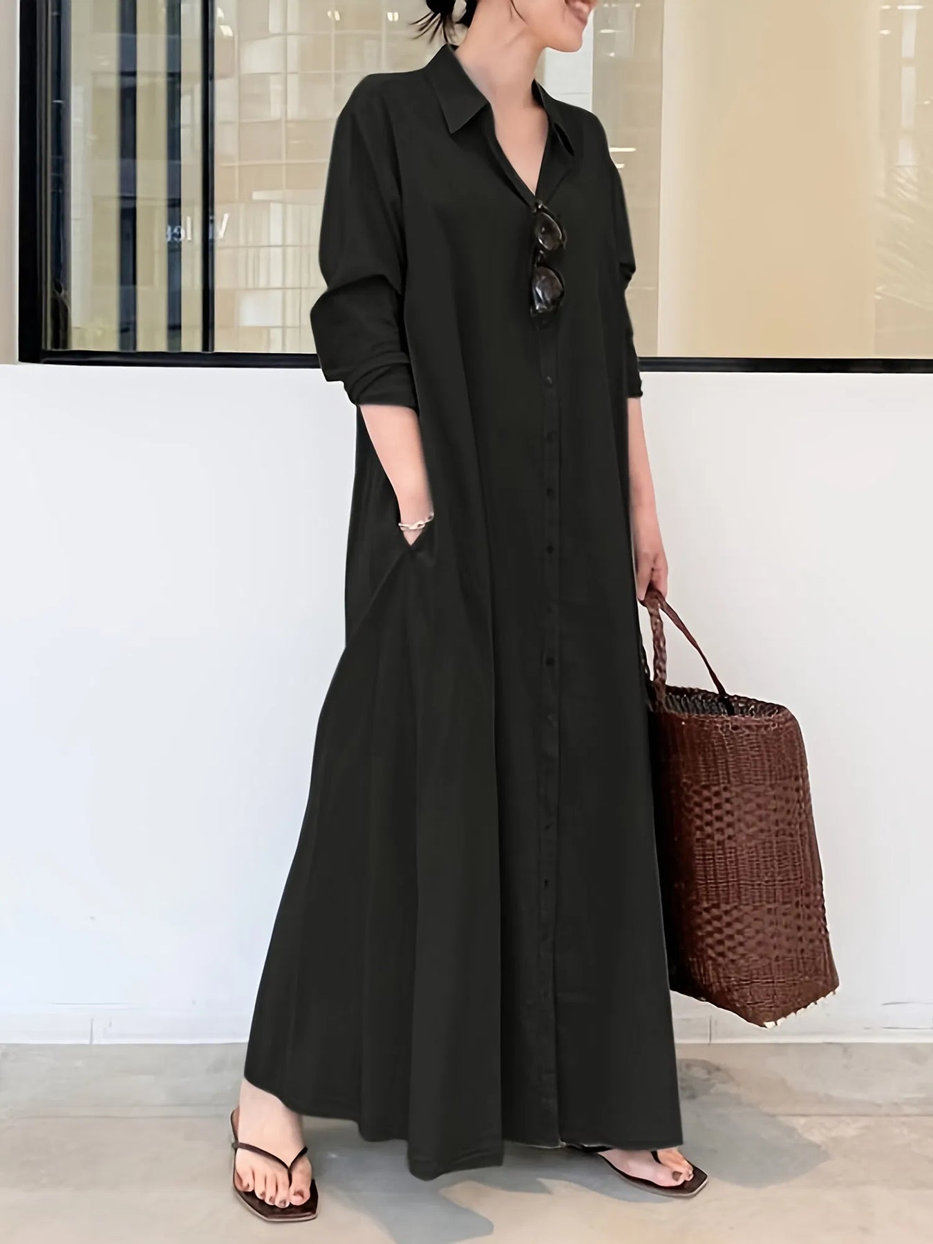 Vores populære skjortekjole er den perfekte blanding af komfort og stil – ideel til arbejde, fritid eller bare til at føle sig godt tilpas. Den løse pasform, det ensfarvede design og den gennemgående knaplukning gør den til en ægte allrounder, man bare må elske.