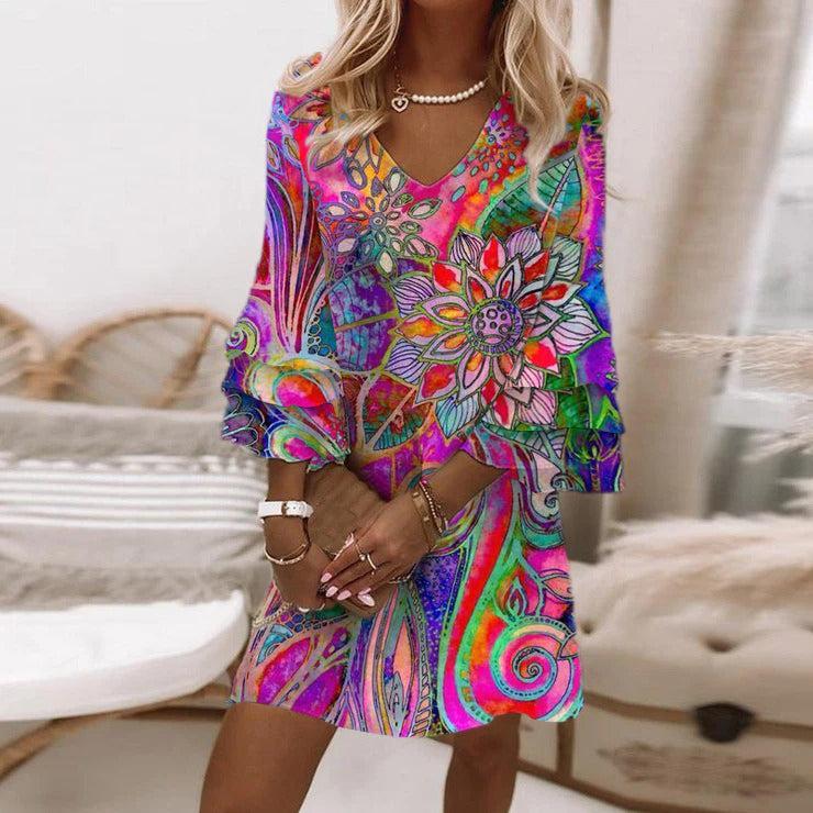 Cecilie® | Farverig Mini Kjole med 3/4 Ærmer