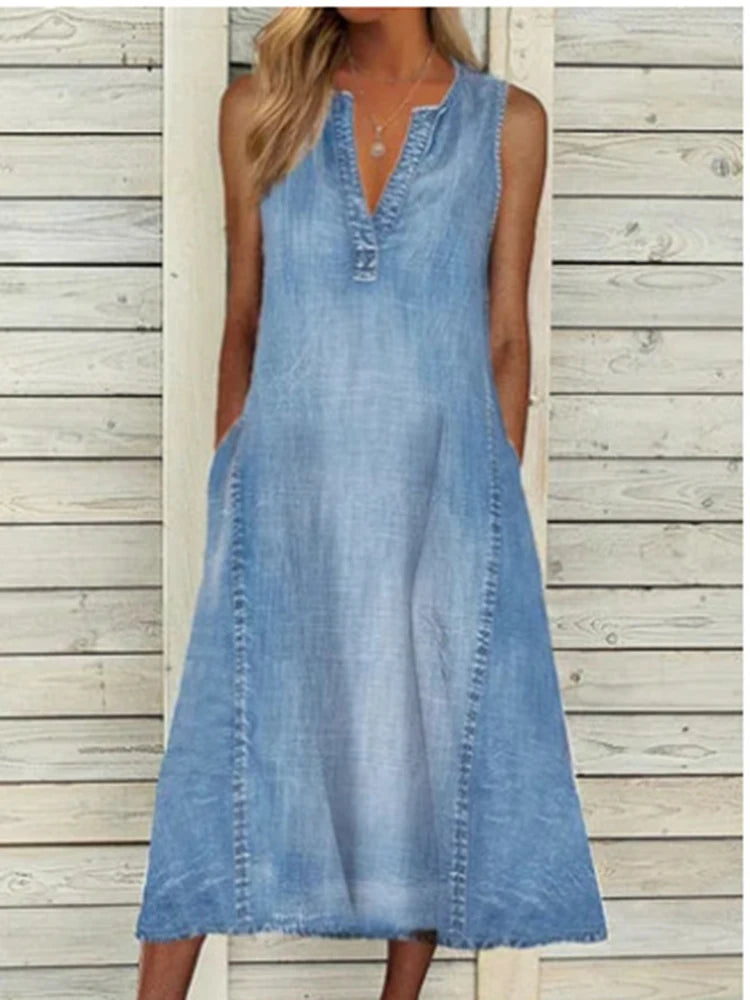 Malou® | Blød denim-kjole med V-hals
