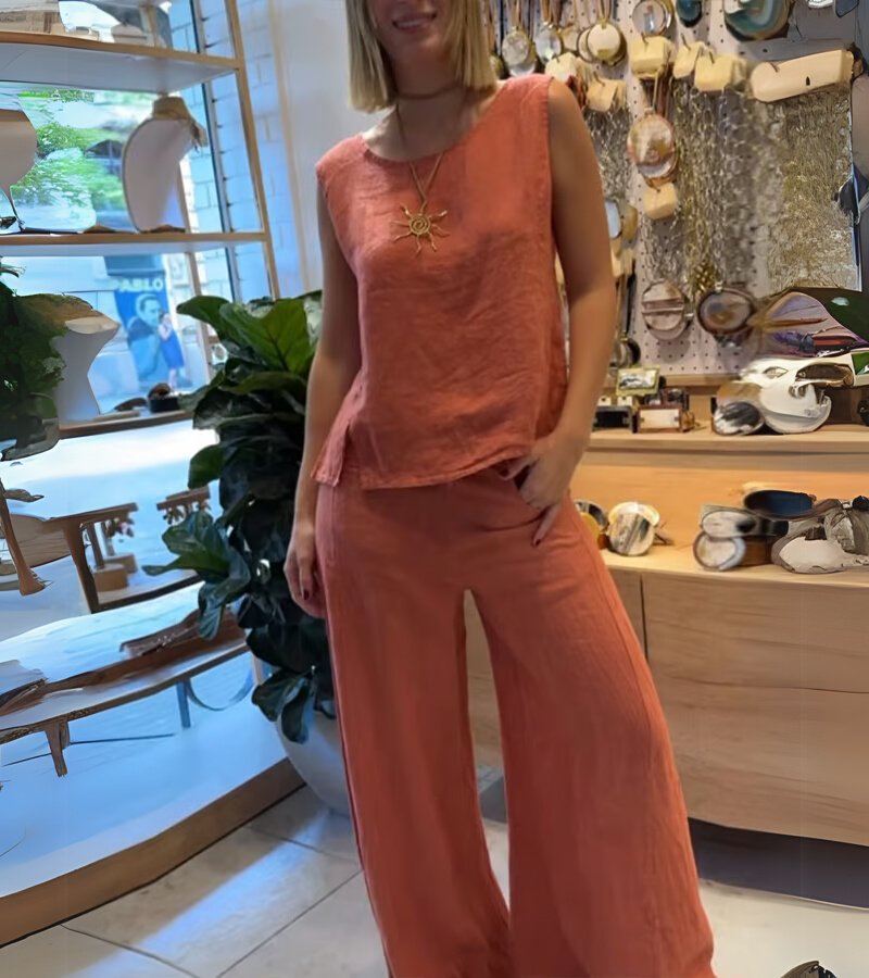 Opdag det perfekte sæt til sommeren: fremstillet i let linned, forener dette sæt komfort og stil i et tidløst design. Den ærmeløse top giver en luftig pasform, mens de brede bukser sikrer bevægelsesfrihed og et sofistikeret look. Ideelt til varme dage, er dette outfit perfekt til byen, ferien eller en udendørs aperitif. Tilgængelig i naturlige og moderne nuancer, er det et must-have i sæsonens garderobe.